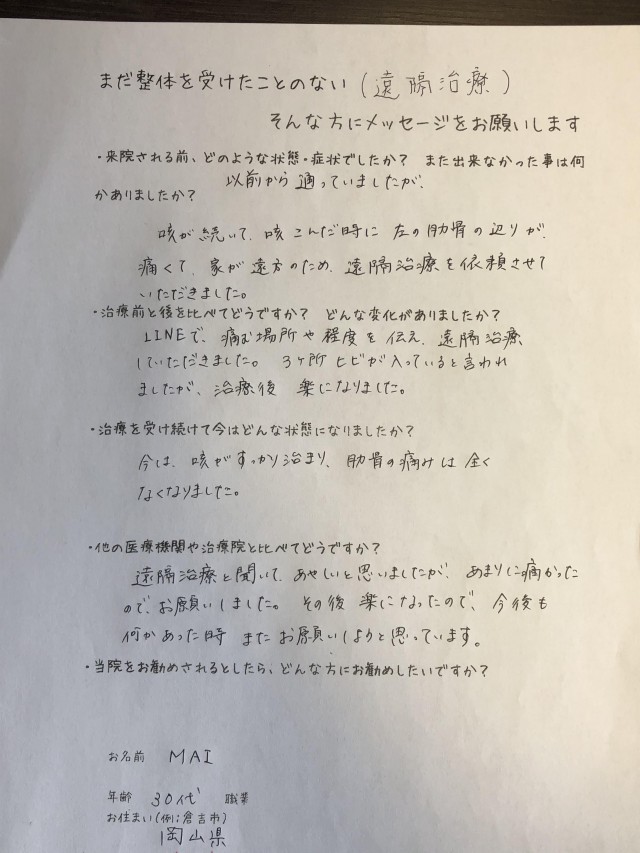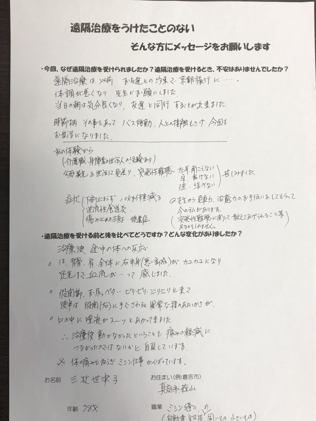 来院時の効果と、遠隔施術での効果に不安は無くなりましたと安心されておられました。