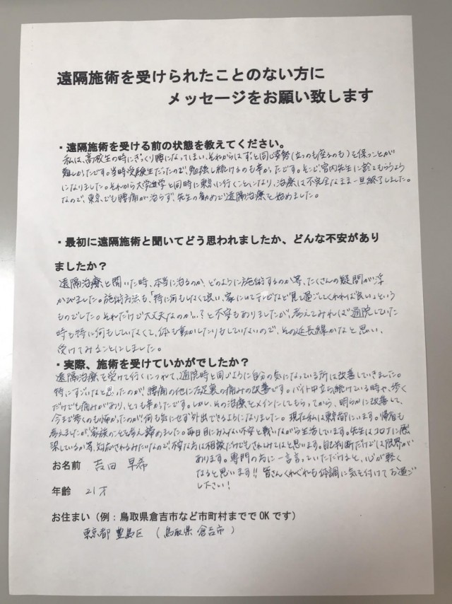 以前、学生時代に来院されていましたが進学により東京へ引っ越しされ、その後も施術を継続されたいとのことで遠隔施術に切り替えました。普段もLINEでやり取りしながらカウンセリングを行い施術させて頂いています。